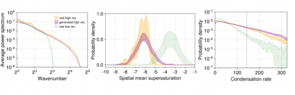 Finally, in the right panel of Figure 2, we show the distribution of an idealized condensation rate metric and focus on the right tail of the condensation rate distribution (the vertical line represents the 99th percentile); this allows us to gauge how well extreme condensation events are represented. We find that there is strong lift in the tails so that extreme event probabilities in the generated high-resolution data almost match the extreme event probabilities in the real high-resolution data (see [1] for additional details).